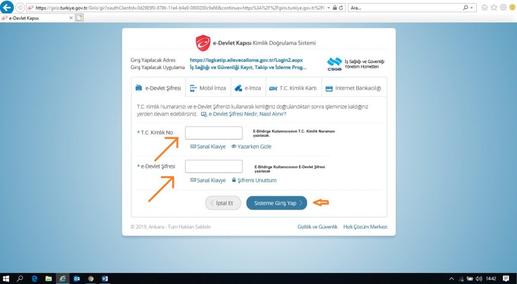 ” İSG KATİP GİRİŞ ” butonuna tıkladıktan sonra, açılan ekranda kırmızı ok ile işaretlenmiş yere ” E-Devlet ” giriş bilgilerinizi giriniz. (RESİM 2)