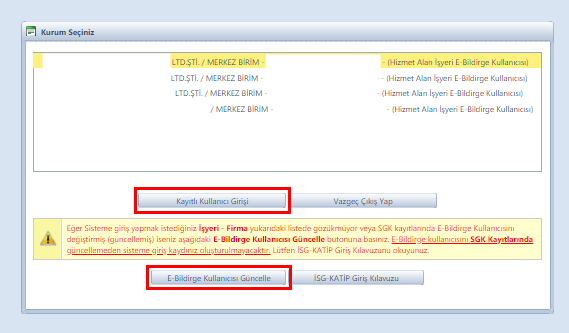 Açılan pencerede adınıza kayıtlı işyerinin “TİCARİ ÜNVANI” ve “SİGORTA SİCİL NUMARASI” yer alacaktır. İşlem yapmak istediğiniz işyeri bilgisini seçip, “KAYITLI KULLANICI GİRİŞ” butonuna tıklayınız. ( RESİM 4) Eğer,adınıza kayıtlı birden fazla işyeri varsa işlem yapmak istediğiniz işyerini kaydırma çubuğunu hareket ettirerek bulabilirsiniz. İşlem yaptırmak istediğiniz işyeri bilgisi açılan sayfada bulunmuyorsa “E-BİLDİRGE KULLANICISINI GÜNCELLE” butonuna basmanız gerekmektedir. “E-Bildirge Kullanıcısını Güncelle” işlemi yaklaşık olarak 3 gün sürmekte ve 3 gün sonrasında işyeri bilgileriniz sisteme yansımaktadır.