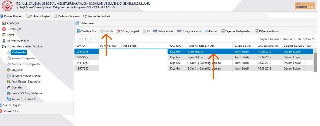 Sözleşmeler sayfasına girdikten sonra karşınıza iş yerinize görevlendirilen İş Güvenliği Uzmanı, İşyeri Hekimi ve Diğer Sağlık Personeli görevlendirmeleri çıkacaktır. FALEZ OSGB tarafından yapılan görevlendirmeleri tek tek seçerek üst panelde yer alan “ONAYLA”, açılacak pencerede ise ” KAYIT” butonuna tıklayınız. (RESİM 6)